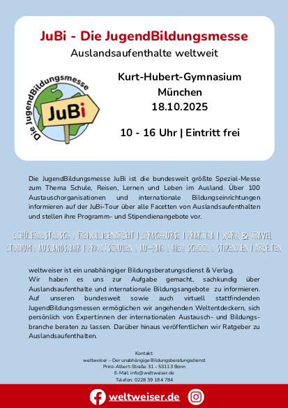 Die Messe für Schüleraustausch, High School, Auslandsjahr, Sprachreisen, Summer Camps, Ferienfreizeiten, Jugendreisen, Au-Pair, Gap Year, Work & Travel, Freiwilligenarbeit, Praktika & Studium im Ausland